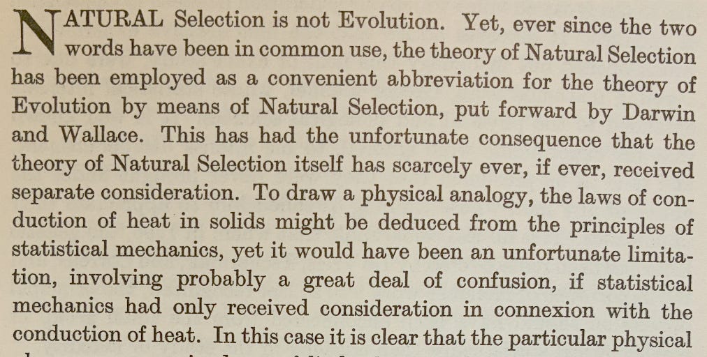 But the point that he made in 1930, that natural selection is not evolution, is one that should be recited to all undergraduates.1 My mentor (he perhaps would have rejected that claim), David Hull once wrote “Evolution is so simple almost anyone can misunderstand it.” But it depends on what work “evolution” is doing here. Does he mean “evolution by natural selection” or “evolution itself, however realised”? Hull was a clear thinker, but I suspect he meant the former, in the way Fisher described.